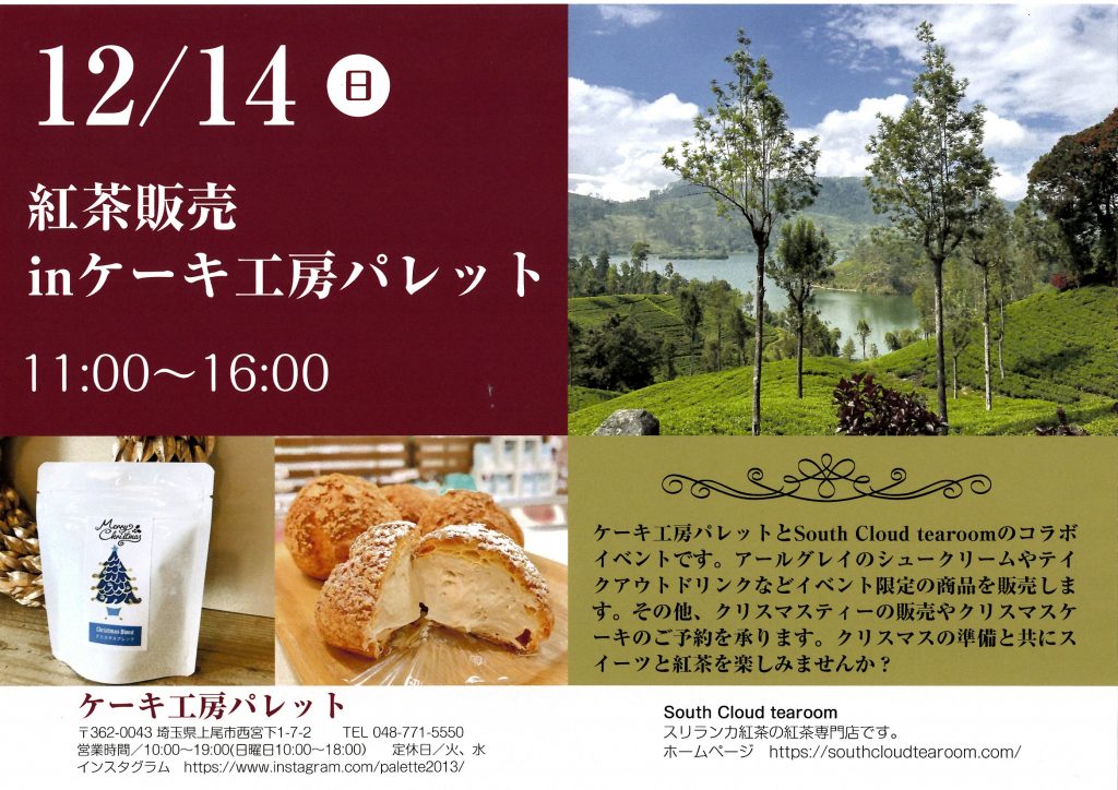 12月イベント出店のお知らせです。 紅茶販売in ケーキ工房パレット12/14(日) 11:00~16:00…